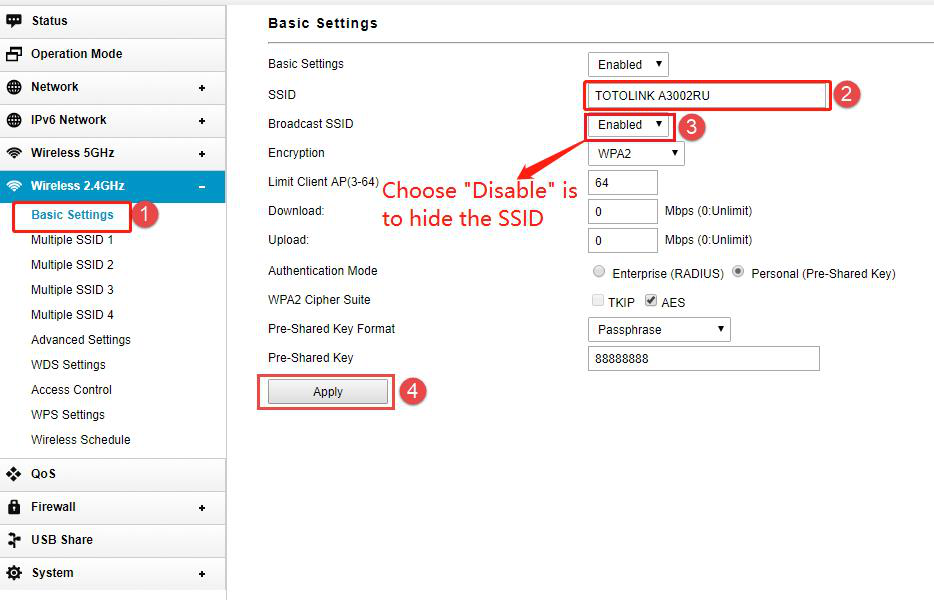 STEP-3: Click Wireless->Basic Settings on the navigation bar on the left. To change the SSID, you can input the new SSID to replace the original SSID. If you want to hide the SSID, choose “Disable” in the SSID broadcast bar. Then click “Apply” in the lower right corner.