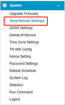 STEP-3: Click System->Save/Reload Settings on the navigation bar on the left.