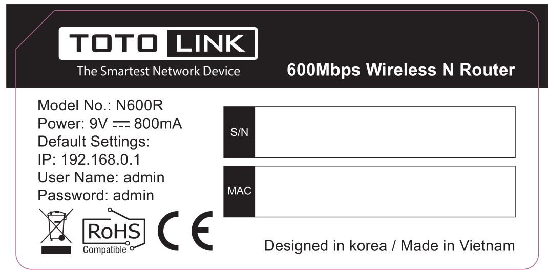 For most TOTOLINK routers, you can see two bar coded stickers at the front of the device, the character string started with Model No.(for example N200RE) and ended with Hardware Version (for example V2.0) is the serial number of your device. See below: