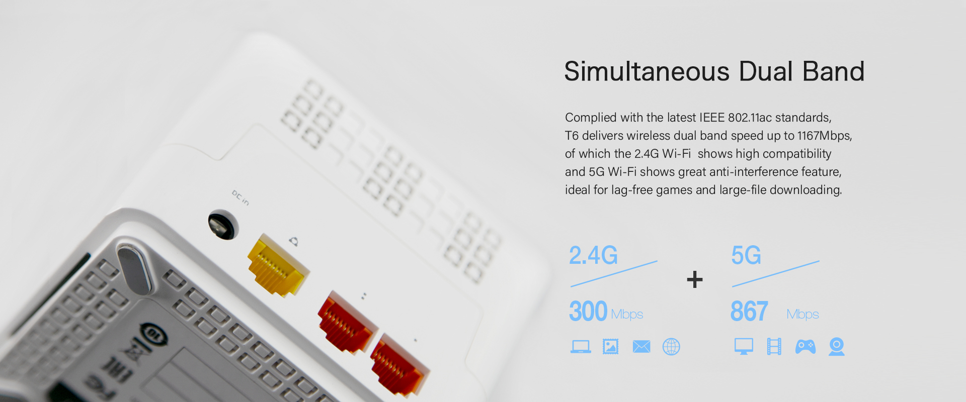 With 1167Mbps dual band concurrent Wi-Fi and one click auto connection functions, T6 easily and efficiently effectuates the Wi-Fi Coverage even under big flats, multiple floors, etc complicated envionments.